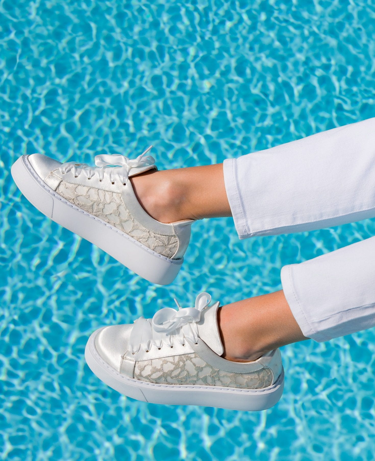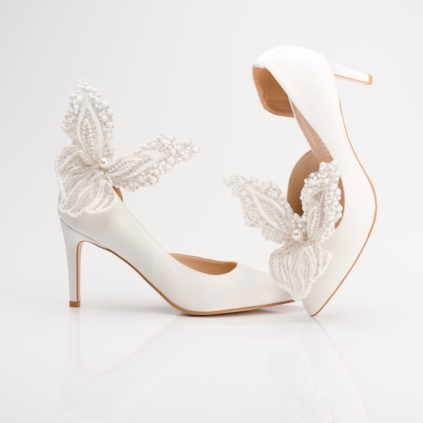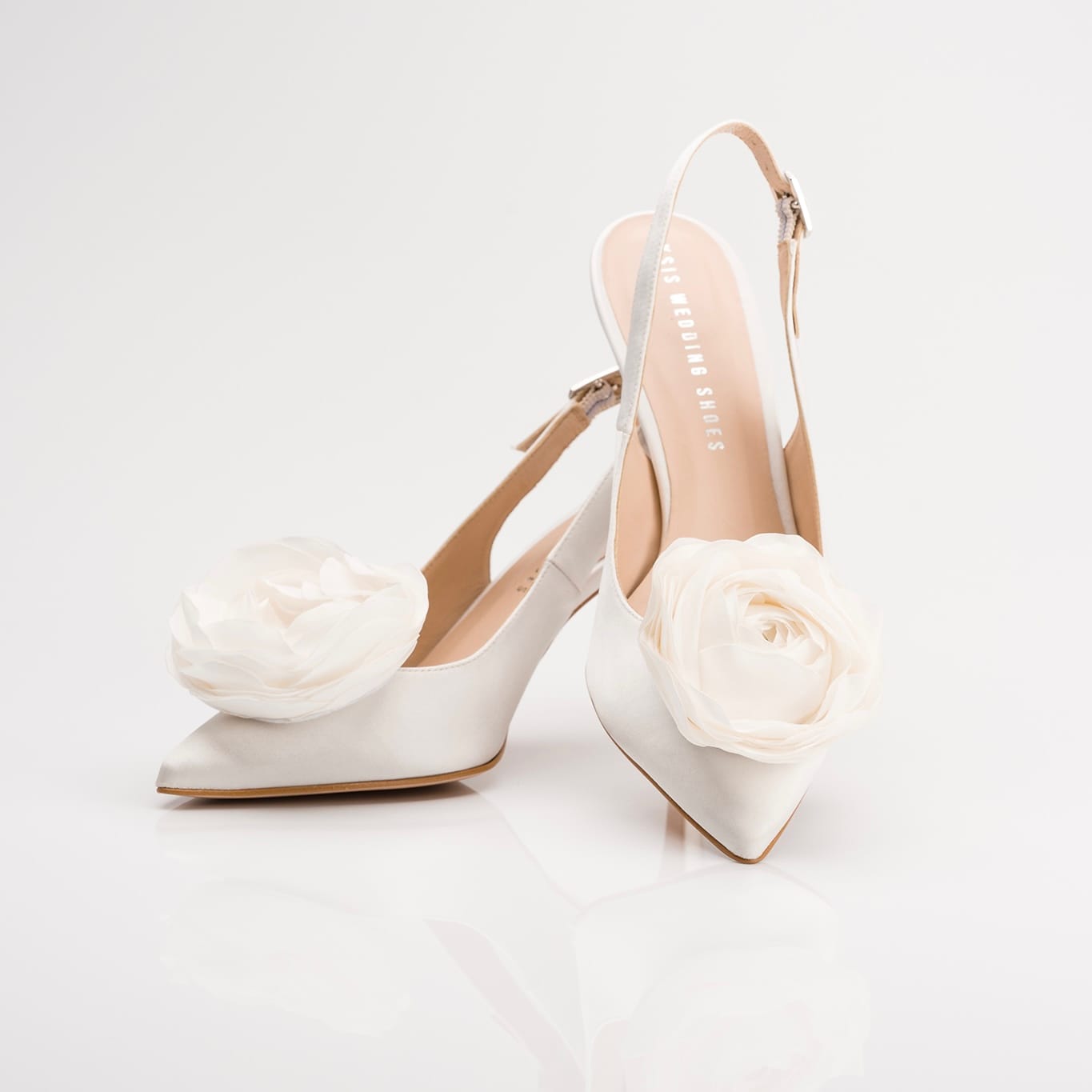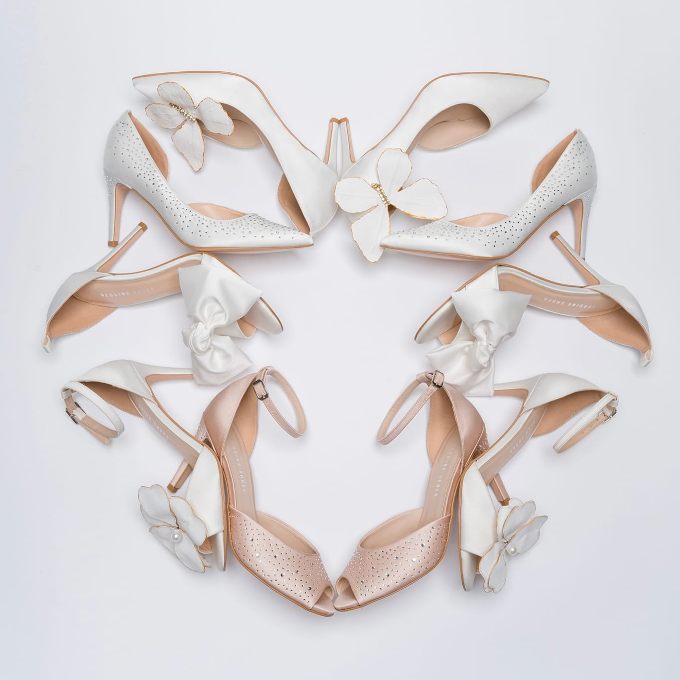 Włoskie atłasowe cholewki, które podkreślają klasę i ponadczasową elegancję każdej pary. Kolekcja biżuterii do butów wykonywana jest z jedwabiu Armani i tkaniny Pronovias.