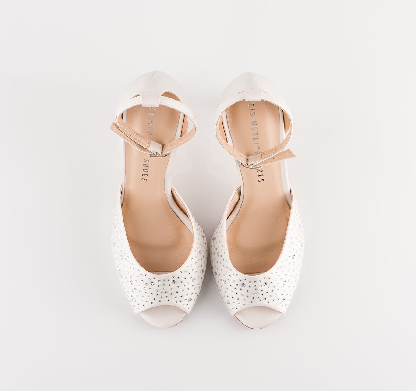 The Marion sandals loved by brides and witnesses alike. This season in a plain version and possible clips that you clip on and off when you want. In the plain version, they are perfect with a long gown or a richly embellished dress. The waisted strap at the front holds the foot sensationally, and its semicircular cut will work well on wider feet. This cut is timeless and classic. It will never go out of fashion.